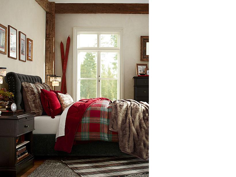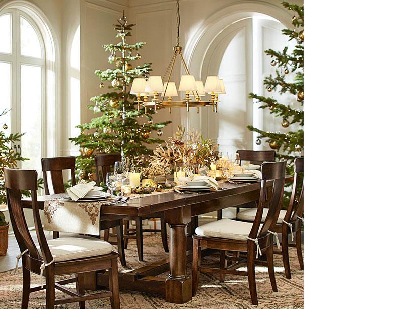 Here, a long wood table is set for a memorable meal, with sparkling glassware and a dazzling centerpiece. A runner lends definition to the elaborate tablescape and allows the simple white dinnerware to shine. Matching chairs and a coordinated palette of cream and gold, from the chandelier shades to the rug, gives the room year-round polish and establishes a neutral stage for a range of updates and accessories.