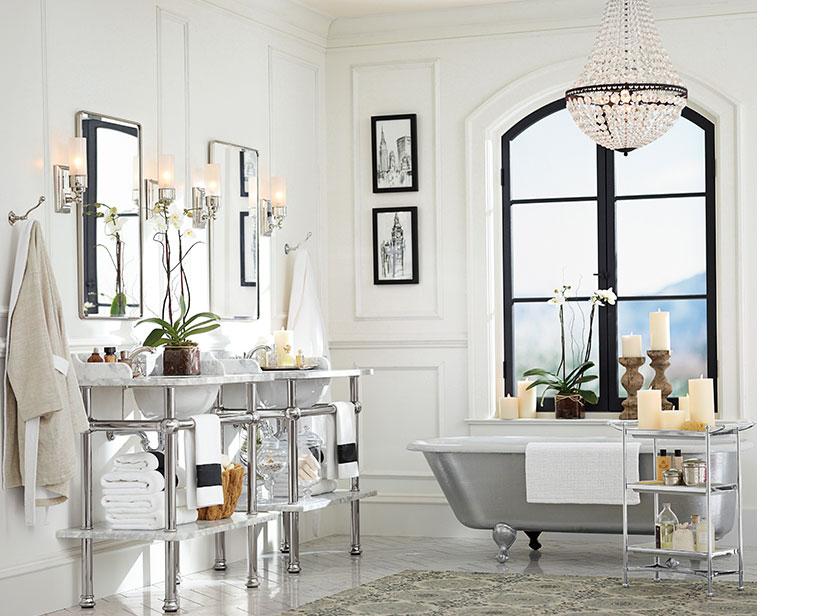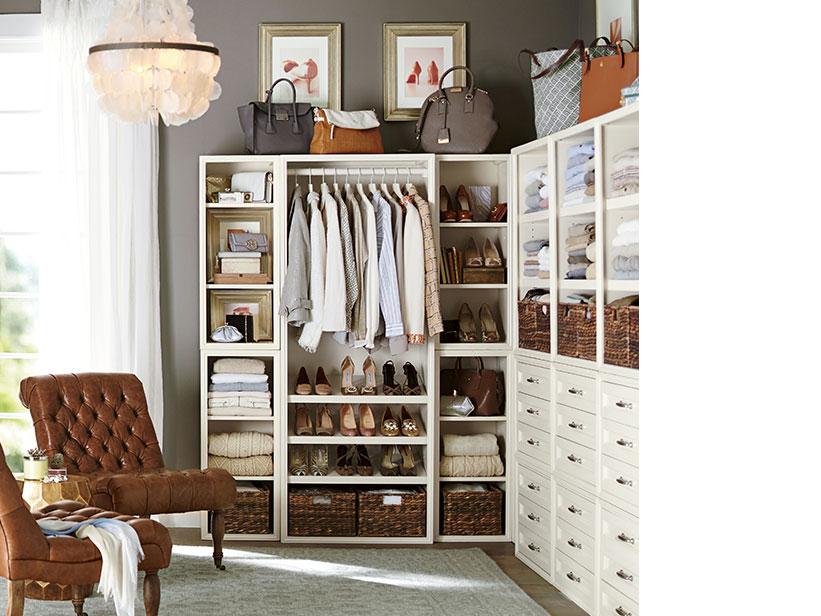 An extra room converted into a closet needn’t be kept behind closed doors. Here a combination of closed and open storage allows for an easily accessible, and attractive, display of clothes, shoes and accoutrements. Two leather chairs give the room a finished look, and provide a ready spot to relax for a moment, decide on the day’s outfit and put on shoes. A rug keeps bare feet warm, and defines the space with elegance.