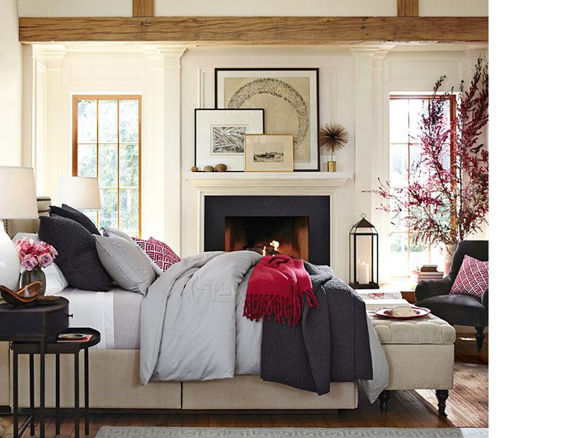 A restrained use of vibrant red brings out the richness of this room’s charcoal, gray and ivory palette. Contemporary artwork and a small collection of natural treasures create a pleasing display on the fireplace mantel, while softening the symmetry created by the windows. An upholstered bench and chair offer seating and a place for reading materials, clothes and blankets.