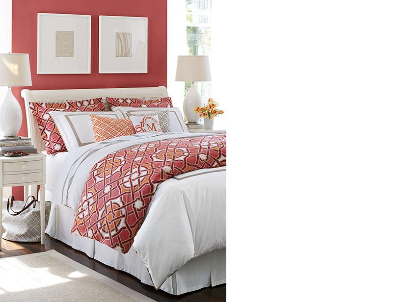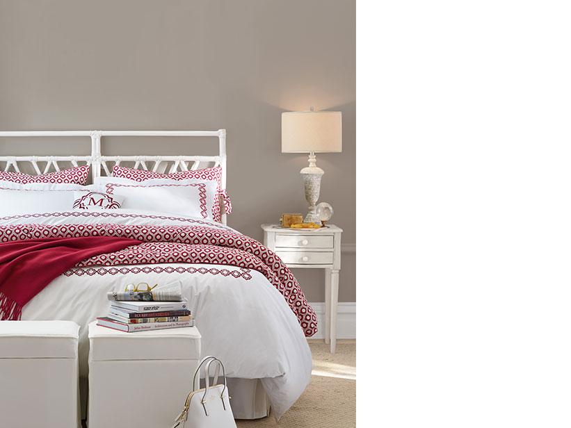 A crisp, neutral palette spiked with plenty of red turns a minimalist room into a vibrant space. Lofty layers of bedding in a white-and-red mix appear both cozy and cheerful. At the foot of the bed, two upholstered cubes make a ready spot for sitting or reading materials, plus their lids lift-off to store blankets and linens. A rattan headboard adds character, and a mother-of-pearl inlayed lamp adds luxury and polish.