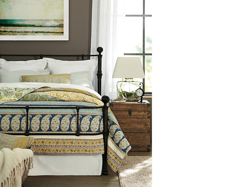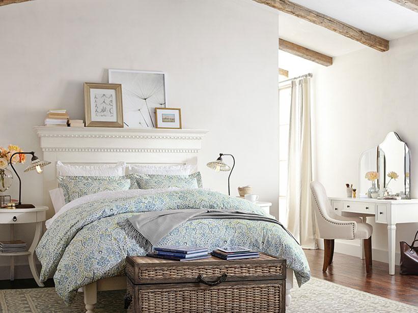 Fresh white walls allow pretty bedding and beautiful furnishings to shine. A palette of blues on the bed and rug, along with two antique-style lamps, add life. Modern photography contrasts nicely with the vintage-inspired elements in this bedroom. A woven trunk adds balance, texture and visual depth. The bed’s beaded accents are echoed nicely in the upholstered chair’s nailhead trim.