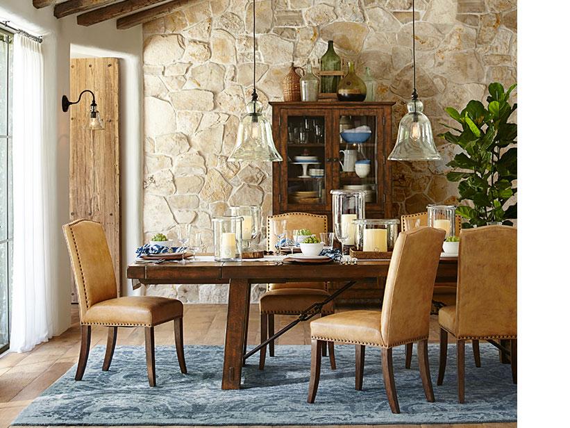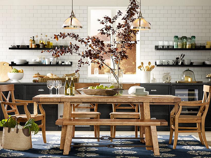 An oversized branch as a centerpiece and rustic wood furniture sets a casual tone in this bright and airy eat-in kitchen. A wool dhurrie keeps the dining area separate from the rest of the kitchen, and also adds a central pop of color. All-white dinnerware is, as always, simple yet sumptuous, and here it allows the beauty of the natural wood furniture to take center stage.