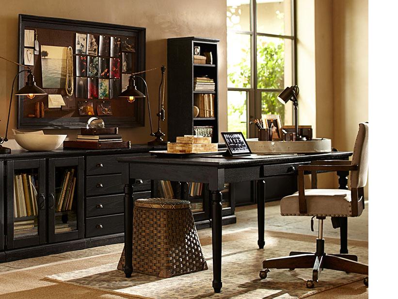 Great furniture and accessories that satisfy work habits and storage needs defines this room as a serious yet creative space. Matching black-lacquered furniture offers plenty of ways to contain and store, and provides ample surface space to spread out and envision and create, plus they add polish. An inspiration board in the same hues as the rest of the room blends in seamlessly, while providing personality and color.