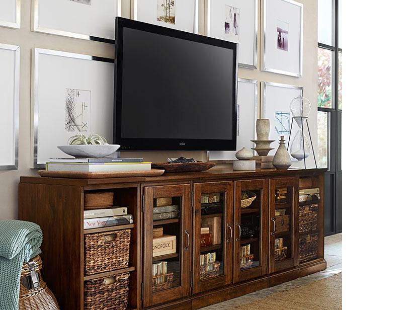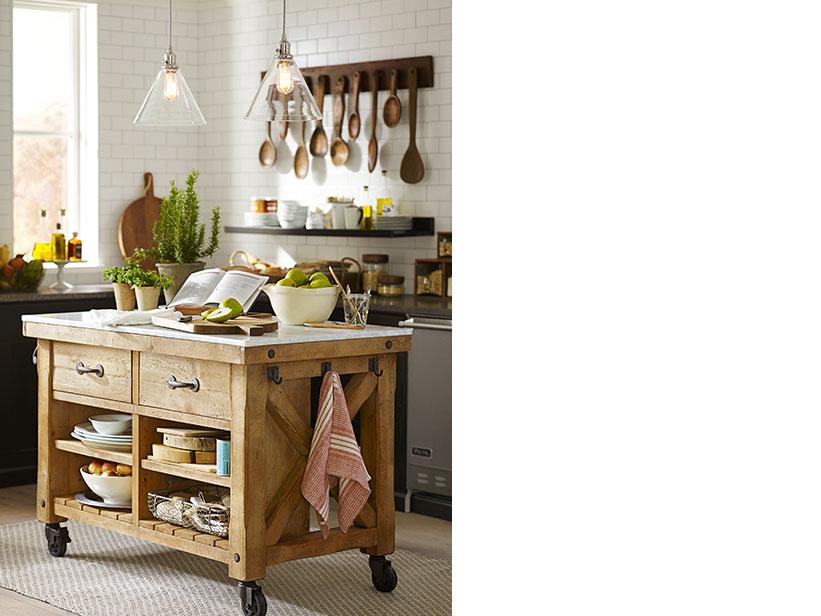 Like all great kitchens, this one uses layout, color and materials to the best advantage. The island adds prep space, and a welcoming spot for family and guests to gather and participate. The wood island sets the room’s tone and palette, with wood decor and essentials creating a warm, harmonious look. Herb pots, fruit and luminous bottled oils bring in natural color. A single red dishtowel is the finishing touch.