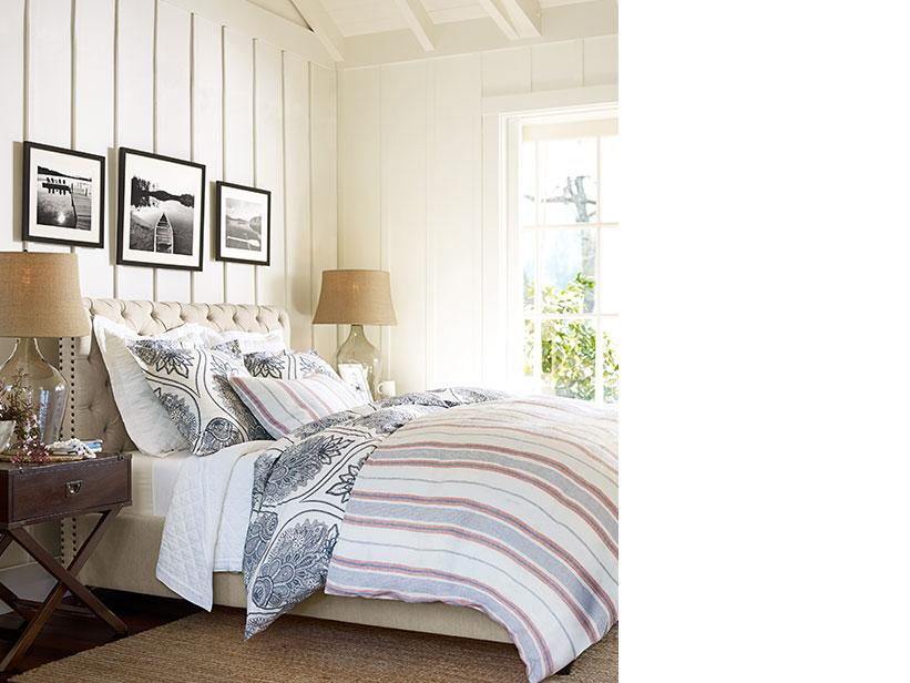 There’s nothing more powerful than varied textures in creating a beautiful space. Here, white beadboard walls, softly colored bedding and a button-tufted headboard have great visual and touchable texture. Clear glass lamps and photos of lake scenes add fluidity and subtle spaciousness. Burlap shades and a natural-fiber rug are effortless, basic touches, but go a long way in adding depth and balance.