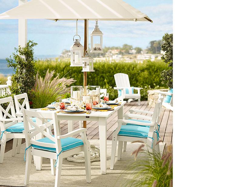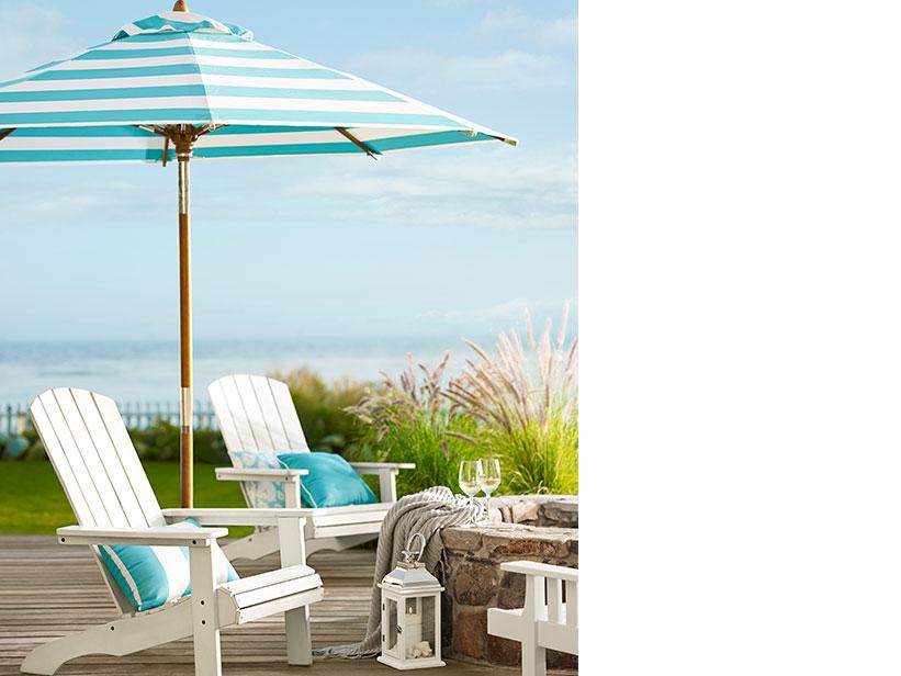 Seating set up for two or three is a delightful sight on a summer day. Shaded by a colorful umbrella, any impromptu gathering here is sure to be convivial and memorable. Aquamarine cushions, echoed by the umbrella, are cheerful and polished. A lantern offers style and light, and a decidedly finished look to even this most casual of spaces.