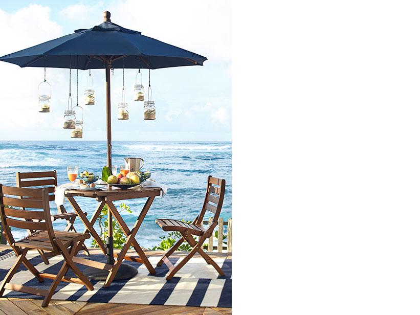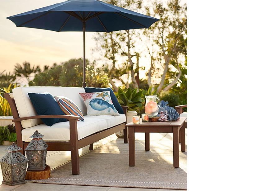 Weather-resistant hardwood furniture, a soft rug and a sharp umbrella canopy make this outdoor room completely livable. Made of teak, a naturally weather-resistant wood, the furniture can boldly withstand humidity, sudden showers and sea spray. Lots of plump cushions make the sofa and chair extra comfortable, and the colorful pillows can be switched out for a whole new look. Elegant lanterns and faux coral are easy, summery touches.