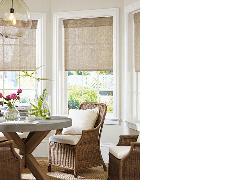 Here, the deep texture of the shades, furniture and rug all work together to give this sunny breakfast nook a relaxed mood. A shared palette of natural color – flax-hued shades, furniture and rug – gives the room its light yet character-rich look. Flowers and cuttings introduce color, and a teardrop-shaped pendant adds polish and mellow light.
