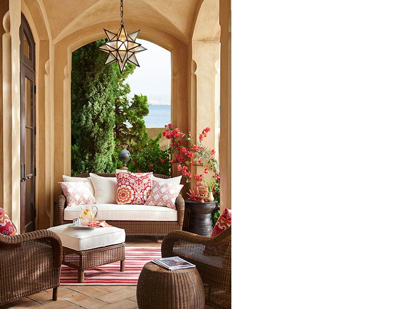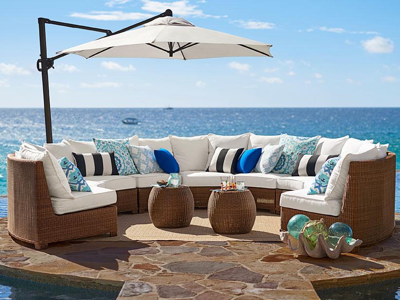 Whether it’s the coziest of corners or the grandest of gardens, this sumptuously comfortable all-weather furniture sets the scene for relaxing outdoors. Pillows in shades of blue, along with the glass buoys, echo the shimmering colors of the sea. Awning stripes provide bold pattern and contrast. Small, portable accent tables create space for drinks and snacks. The umbrella casts much-needed shade and cozies up the area.