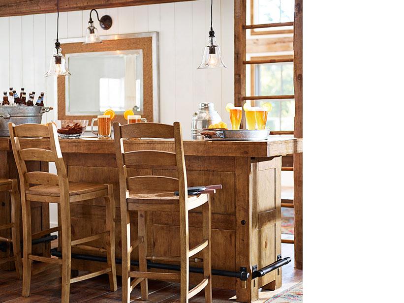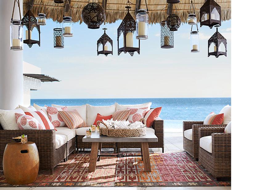 Here, many lanterns are a brilliant design move, injecting the space with a little awe and a lot of mellow light. The lanterns keep the focus on the space itself, yet don’t detract from the view. Shots of orange – in the pillows, rug and accent table – infuse the space with refreshing color. The positioning of the furniture and rug in a square keeps this small spot in the great outdoors feeling cozy and contained.