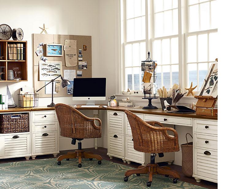 A sky-blue rug offsets this neutral room. A modular desk runs the length of the window, highlighting an incredible view. Shelves, storage baskets and a pinboard keep essentials close at hand. Rattan swivel chairs are a stylish alternative to the traditional desk chair, and offer as much comfort. The mementos all share a single theme, which creates a smart, unified look.