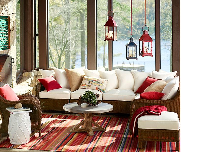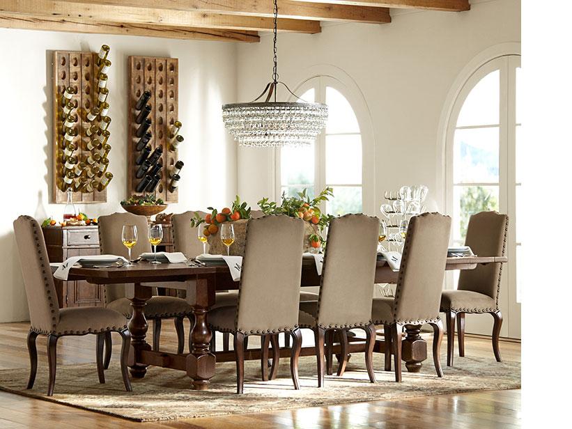 Stunning chandeliers, a big rustic table and matching chairs combine in this warm and welcoming dining room. A collection of seashells and sand-filled hurricanes add a deeper layer of neutral color to the honey-hued furniture. White and clear-blue dinnerware, and ivory walls are refreshing and add sleek clarity to the room’s mostly rustic hues.