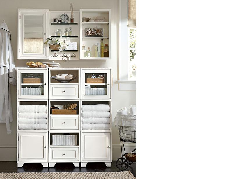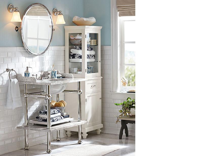Designing a great bathroom is all in the mix — of function, practicality and style, plus a touch of glamour. Here, furniture with a variety of open and closed storage keeps everyday must-haves sorted and accessible. Different containers — striped and wood boxes, glass bowls and bottles – make the look memorable. A very personal display of flowers, perfumes, soaps and lotions give the space individuality and luxury.