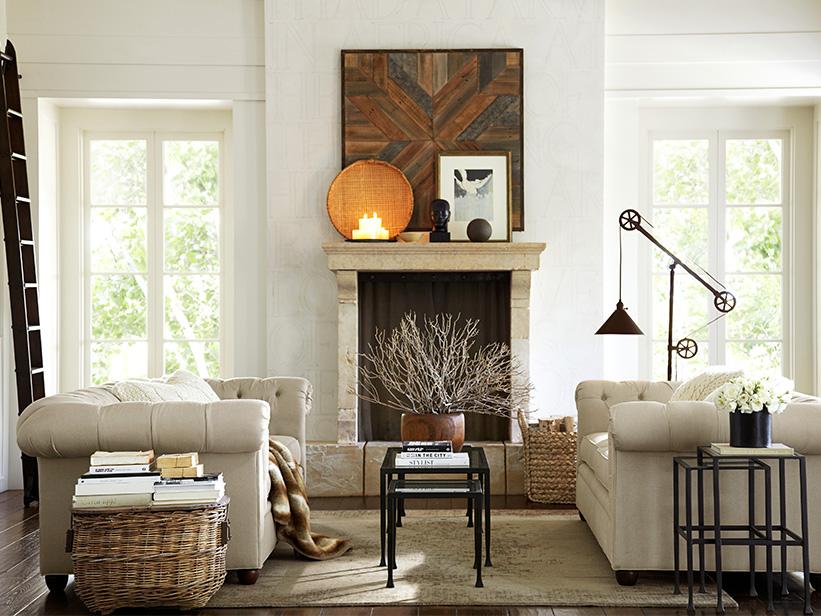 Having great things to look at wherever you turn makes a room beautiful; if it’s functional and cozy too, then the space, like this one, is a success. Here, two grand-sized sofas are more stylish than a single and pack twice the luxury. Diverse accessories – big baskets full of necessities, cherished objects and artwork, flowers and branches – bring the space to life and create a feeling of personal sanctuary.